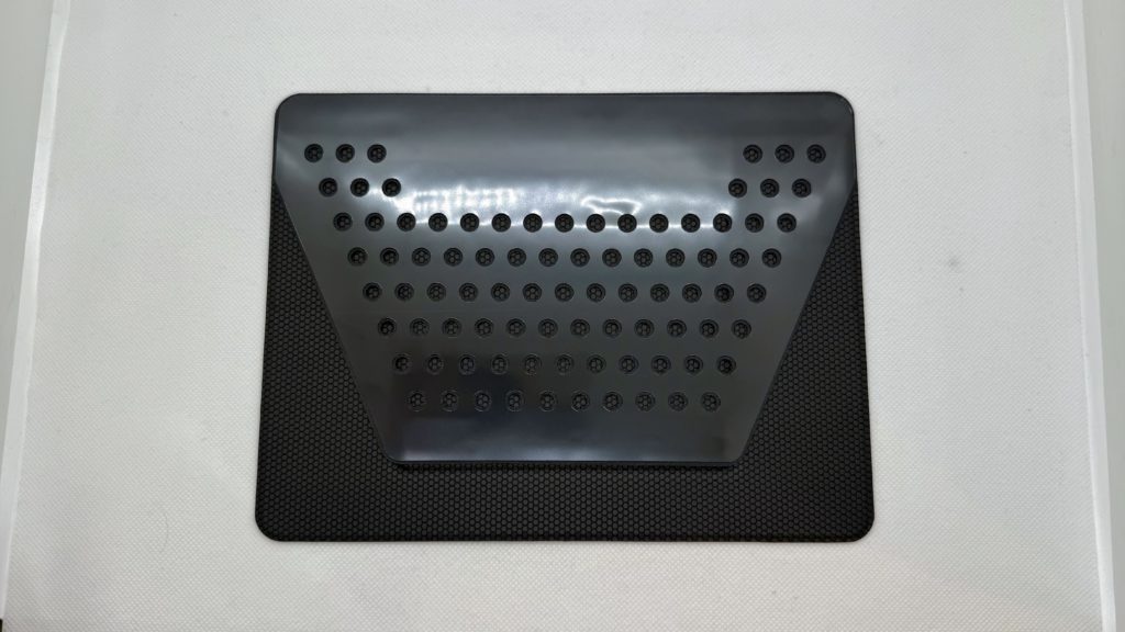裏側は滑り止めの付いたグラスファイバー素材に排熱のための穴があいていて、この部分が繰り返し貼り剥がしの可能(約5~6回)な粘着シールになっているため、PCや保護ケースに直接付けて使用するという仕組みになっています。