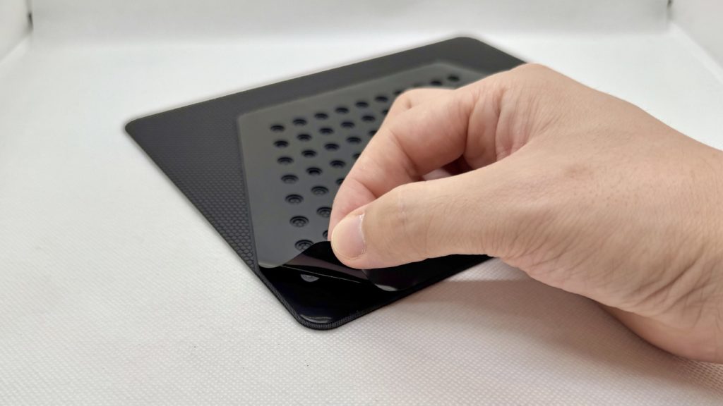 底面に貼ることになるため、埃や指紋汚れを軽く拭いて粘着の保護フィルムを剥がしたら