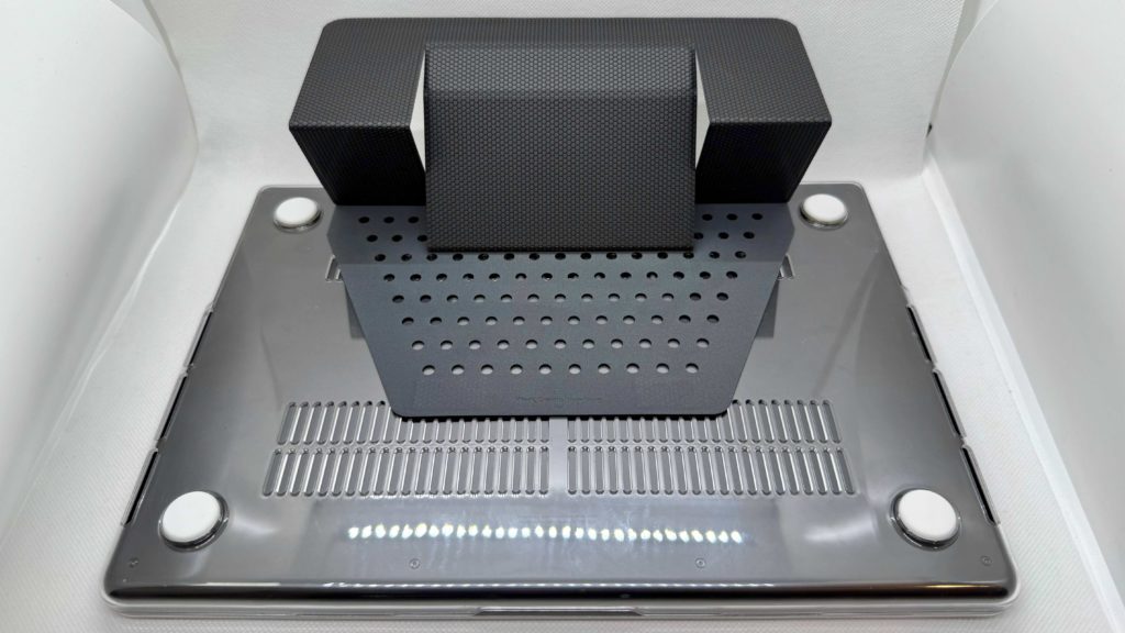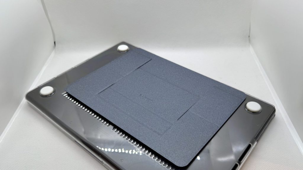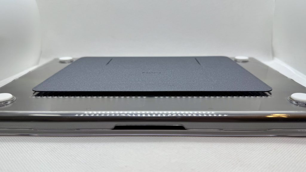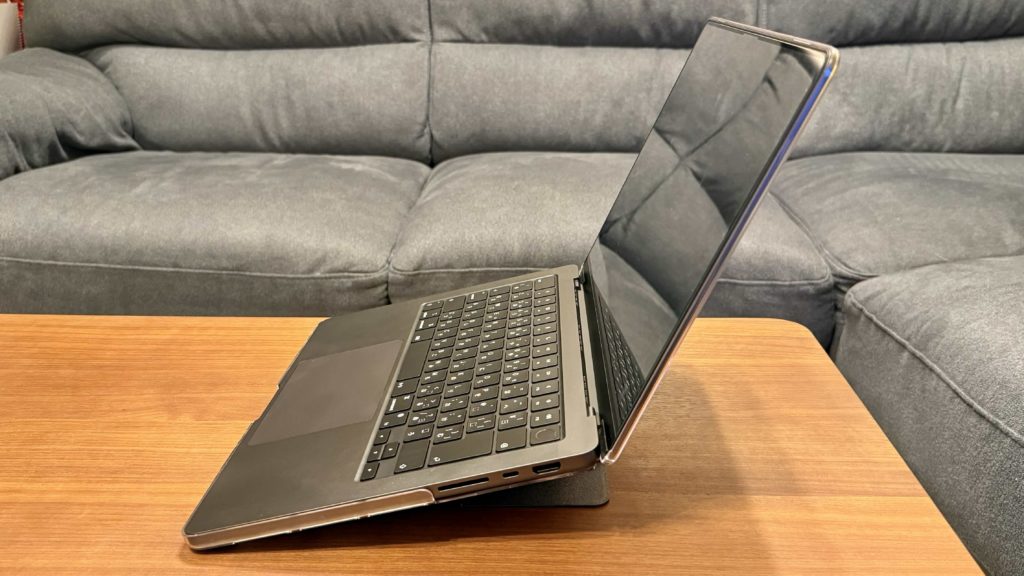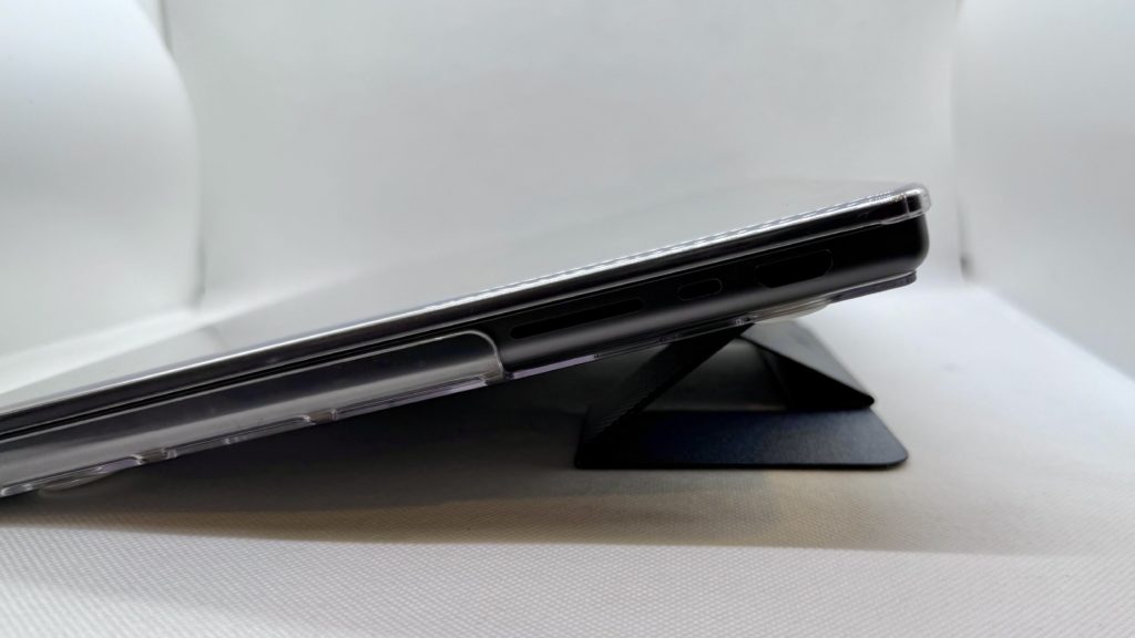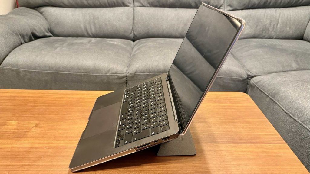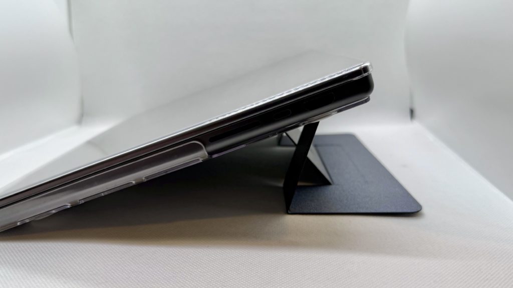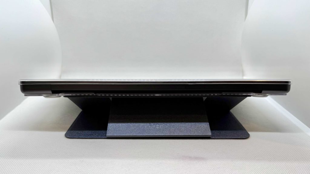 横から見るとこのような感じで、存在感が全くないかというとそんなことはないですが、畳んだ状態で机に置いても厚みでパソコン本体がグラグラ動くこともありませんし、重くなったということもなく、個人的には導入したことによるデメリットは感じられませんでした。(ゴム足の短いモデルではスタンドが接地しますが、それでもグラグラしたりはしません)
