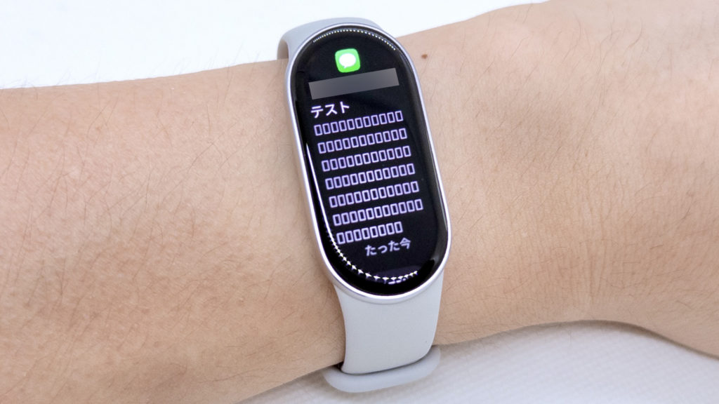 そんな通知機能に関して、スマートバンド側の挙動を確認すると、スマホへ通知がきた1秒後くらいにバイブレーションと共に通知がきて、「手首を上げてスリープ解除」がオンにしてあれば画面を自分に向けるだけでそのまますぐに通知の内容を確認でき、またホーム画面では画面上部に赤い点が表示されて通知が来たことが分かるようになっているのは、これまでと何も変わっていません。