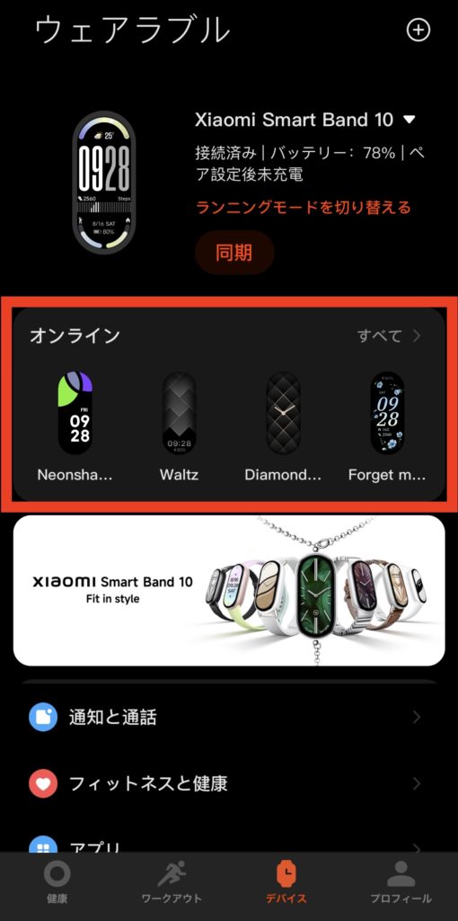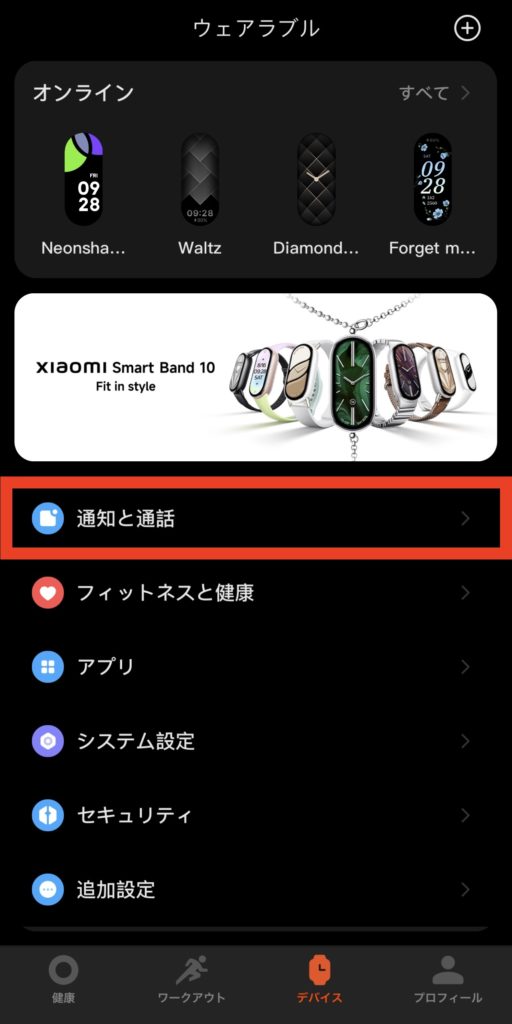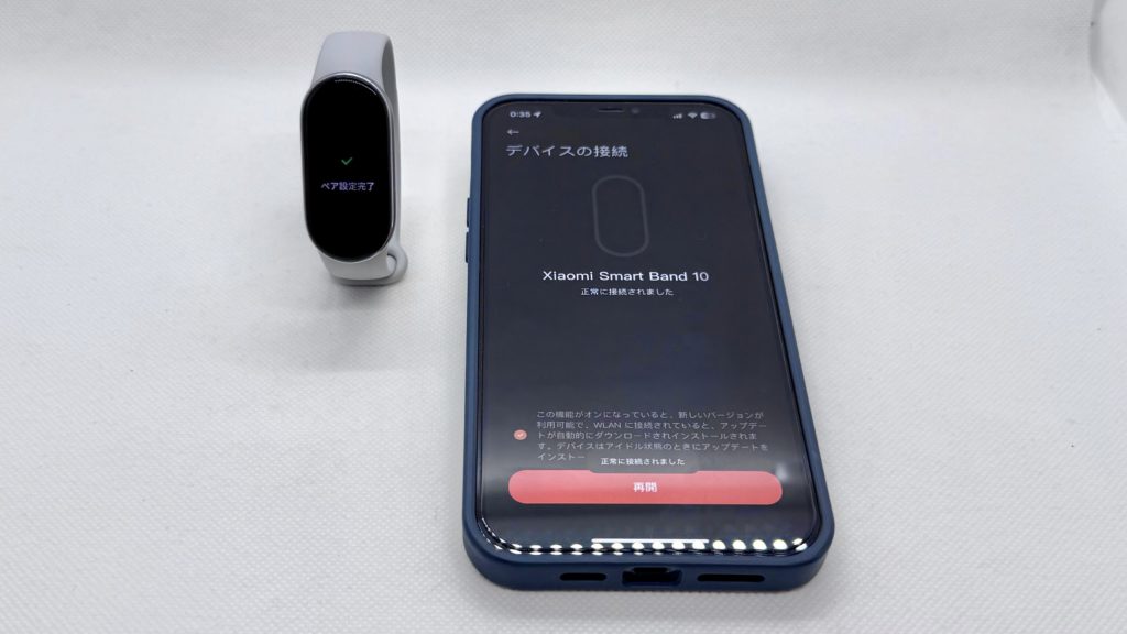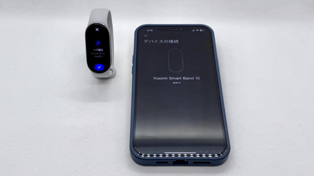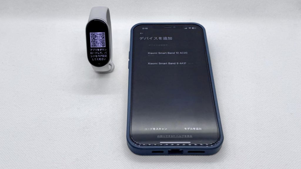 ログインできたら下部メニューの「デバイス」ページより「デバイスの追加」ボタンを押して、スキャンされて出てきたXiaomi Smart Band 10を選び、その後本体側のペア設定のチェックボタンを押しましょう。