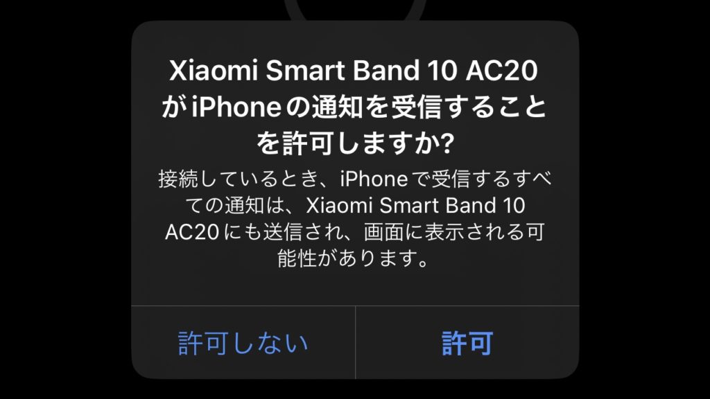 そうするとスマホ側に「ペアリング要求」と「通知の許可」がポップアップで表示されるため、ペアリングして通知も許可してください。