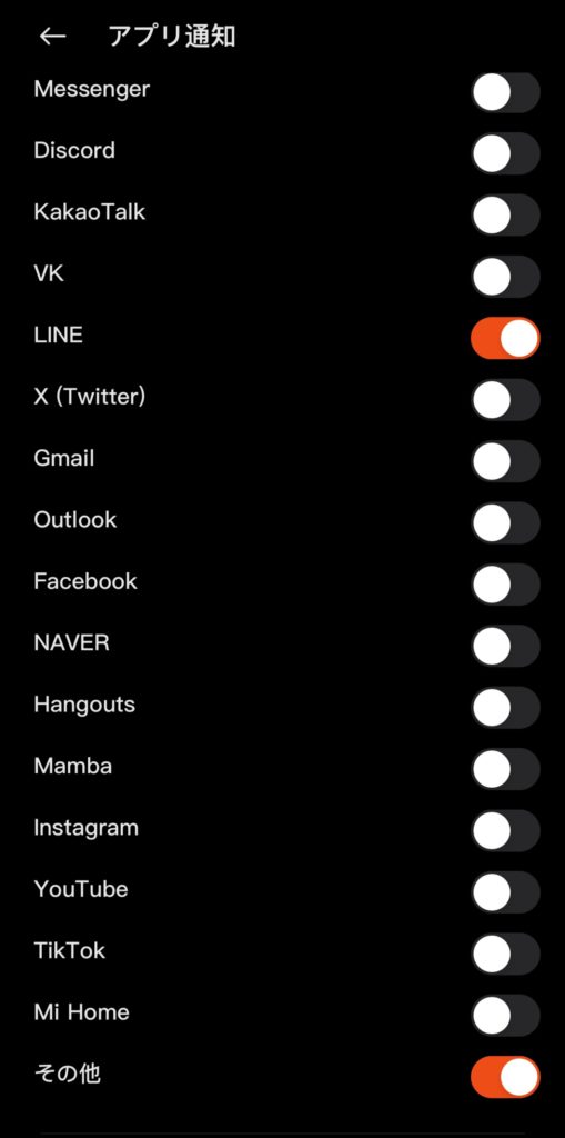 とは言えご覧いただける通り全てのアプリの通知をここでコントロールできるわけではないため、ここにないアプリの通知を受けるには最後にある「その他」の通知をオンにするしかありません。