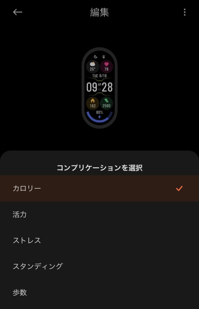 スマートバンド本体から編集する場合にはホーム画面を長押しして、ウォッチフェイス下の歯車マークから編集が可能です。