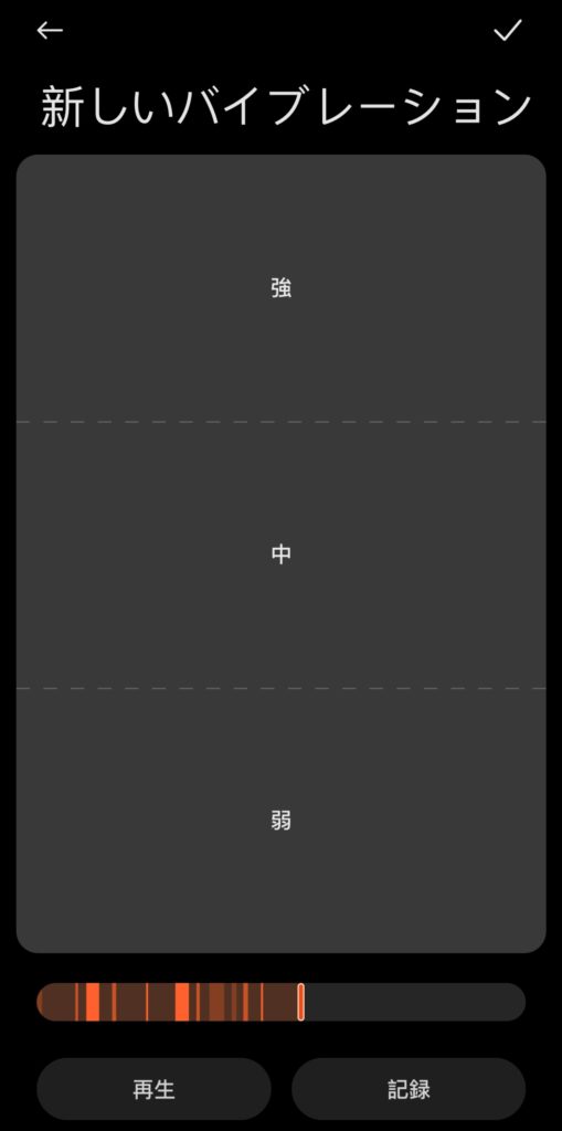 上記のように振動パターンを入力したら右上のチェックマークから保存できるので覚えておいてください。