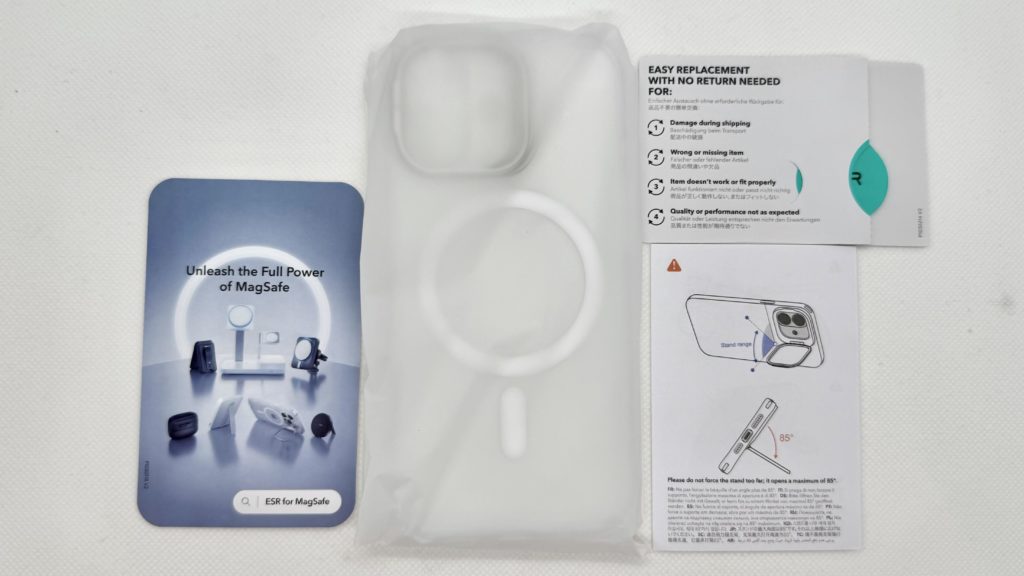 正面左の矢印の部分から開くことができ、横置きではある程度の角度調整(iPhone 17は15°~85°)もできますし、角度は変えられないものの縦置きにも対応しているのはとてもよく考えられていると思いました。(iPhone 17 Pro、Pro Max、Airでの角度調整は15°~69°とのこと)