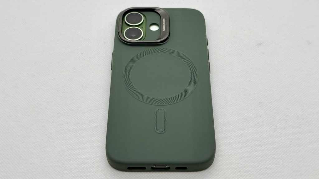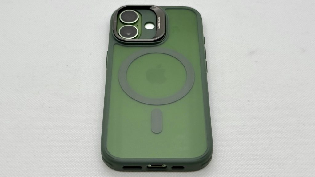 こちらはバンパーとカメラ部分が深緑、MagSafeは緑寄りのグレー、背面は半透明緑というモデルで、どちらかと言えば今回のセージ色のiPhoneに合うように作られた色な気がします。