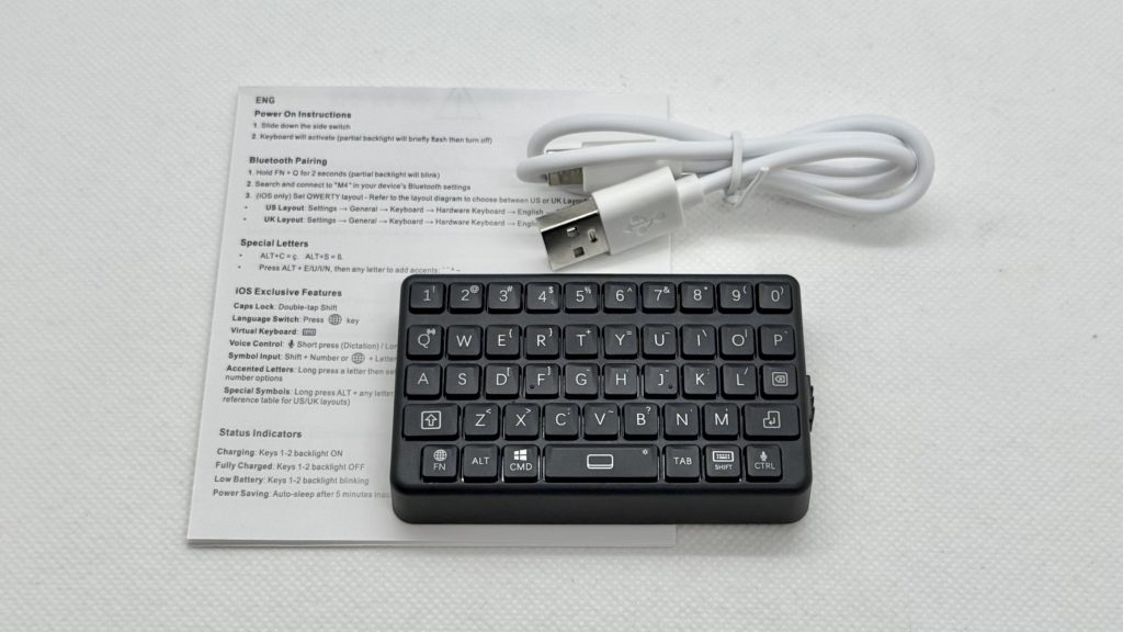 そのためにはペアリングするデバイスをBluetoothの接続範囲に置いてBluetooth設定を開いたら、ミニキーボード側の「Fn + Qキー」を押すことでペアリングモードに入り、デバイス側に「M4」の表示を確認できたらそれを選び、「接続済み」となればペアリングの完了となります。(本体のBluetoothバージョンは5.0とのこと)