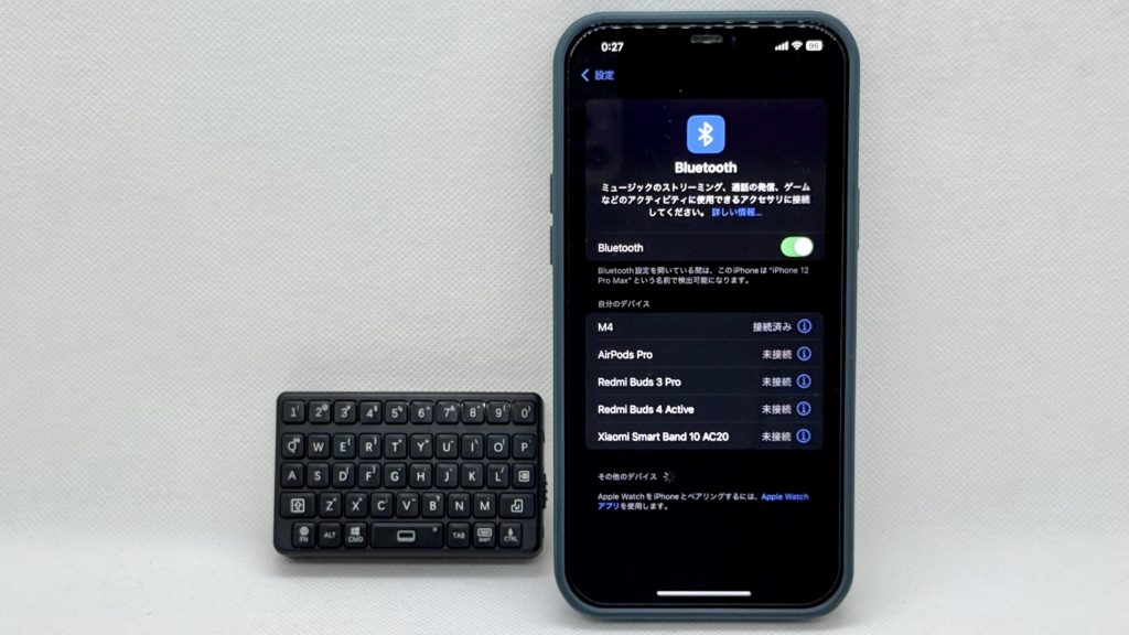 今回は試しにiPhone 12 Pro Maxと接続してみますが、基本的にはiOSやAndroid機、タブレットでもパソコンでも何でも接続することが可能です。(ただし接続先によってそれぞれ挙動が違います)