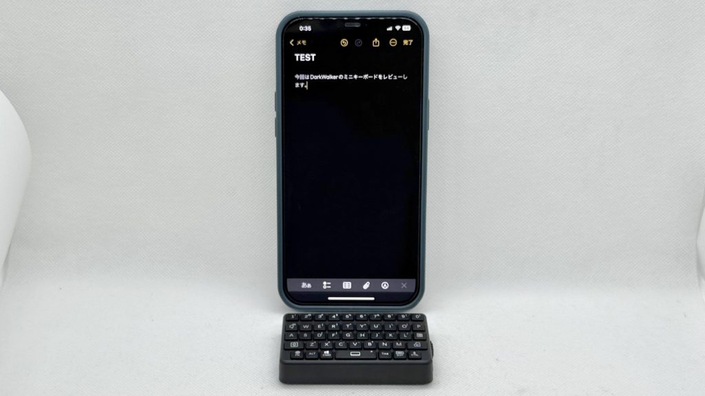 ちなみにiOS環境ではおよそキーボードの表示通りという感じで、Fnキー単体(iOSで言う地球儀マーク)では文字入力の変更ができるし、Commandキーを使ったキーコンビネーションでMacで使えるショートカットと同じものが効くし、右Shift単体ではソフトウェアキーボードが立ち上がり、マイクマークの書かれたCtrlキーでは音声入力がオンになります。