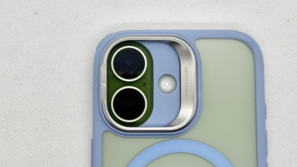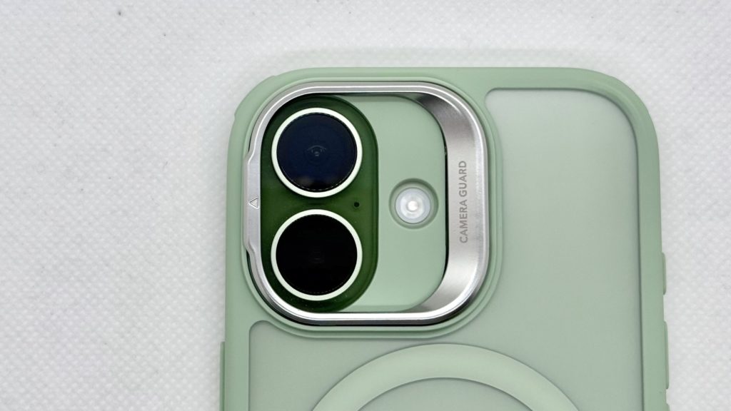 カメラ部分はシルバーの金属パーツで囲まれていて、この部分がカメラを守るバンパーになっています。