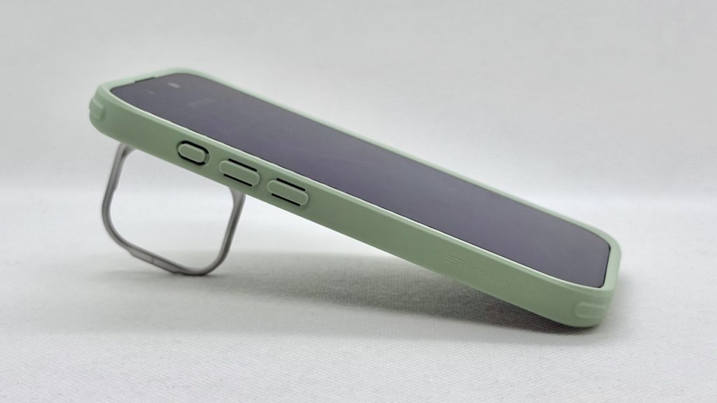 また、このバンパーが持ち上がるのがESRケースの特徴の1つで、持ち上げることでスタンドの代わりになる「隠れスタンド」なる機能があるのが嬉しい仕様です。